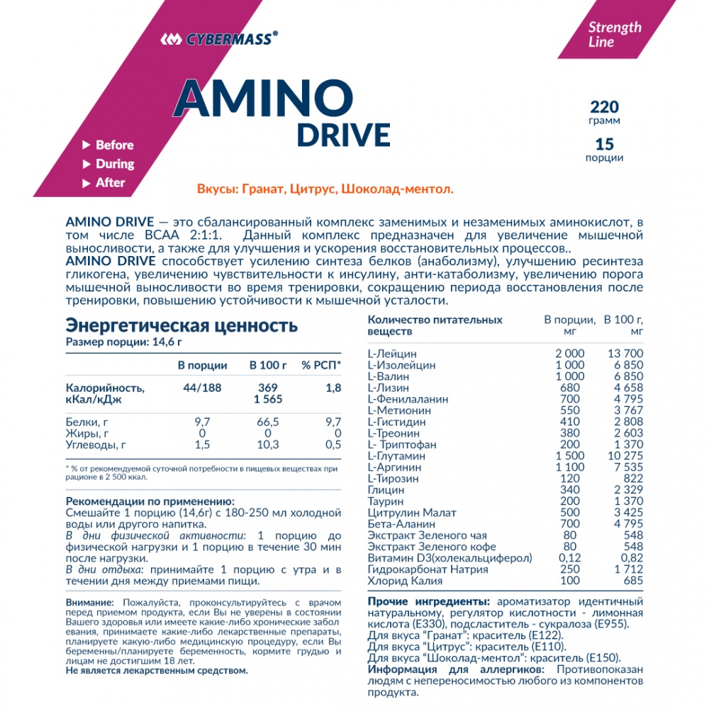 AMINO DRIVE способствует усилению синтеза белков (анаболизму), улучшению ресинтеза гликогена, увеличению чувствительности к инсулину, анти-катаболизму, увеличению порога мышечной выносливости во время тренировки, сокращению периода восстановления после тренировки, повышению устойчивости к мышечной усталости.