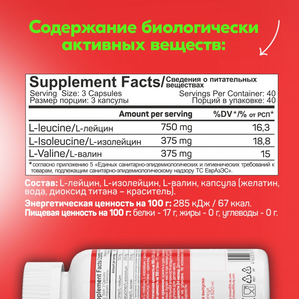 В комплексе сочетаются 3 незаменимые аминокислоты в стандартном и самом эффективном соотношении 2-1-1.