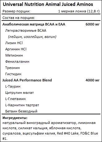 В составе Animal Juiced Aminos от Universal Nutrition содержатся BCAA в соотношении 2-1-1 (лейцин/изолейцин/валин). Данные аминокислоты обладают анаболическими и антикатаболическими свойствами. С одной стороны, они ускоряют синтез белка, с другой стороны, предупреждают разрушение мышц после тяжелых физических нагрузок. Именно поэтому BCAA часто используют атлеты и другие активно тренирующиеся люди, а также те, кто соблюдают диету. Ведь BCAA защищают мышцы от разрушения и подстегивают их рост.