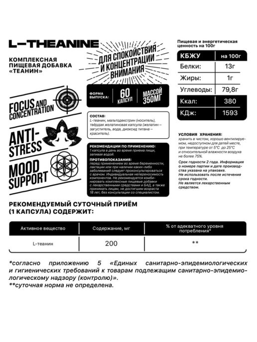 Аминокислота Biohacking Mantra L-Theanine 200 мг 60 капсул
