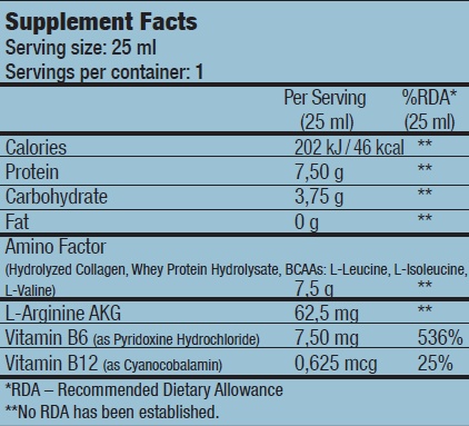 Ингредиенты: Вода, гидролизованный коллаген, гидролизат сывороточного протеина, лимонная кислота, глицин, L-аргинин AKG, L-лейцин, L-изолейцин, L-валин, пиридоксин HCl, цианокобаламин, сорбиновая кислота, ароматизаторы, подсластители: сукралоза