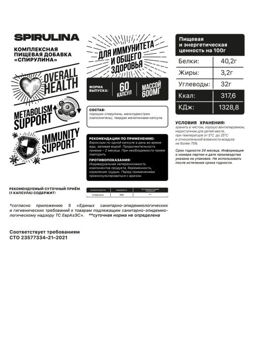 В состав SPIRULINA также входят витамины группы В, витамин С, витамин D, витамин А и витамин Е, образуя сбалансированную формулу и обеспечивая мощную поддержку иммунной системе и организму в целом.