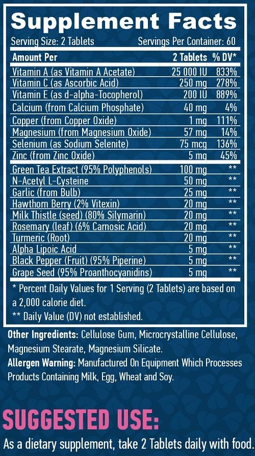 Антиоксидантный комплекс содержит витамины A, C и E, которые являются мощными антиоксидантами. Они укрепляют иммунную систему, удаляют свободные радикалы, снижают риск воспаления и инфекции. Также содержит минеральный комплекс кальция, магния, цинка, меди и селена.