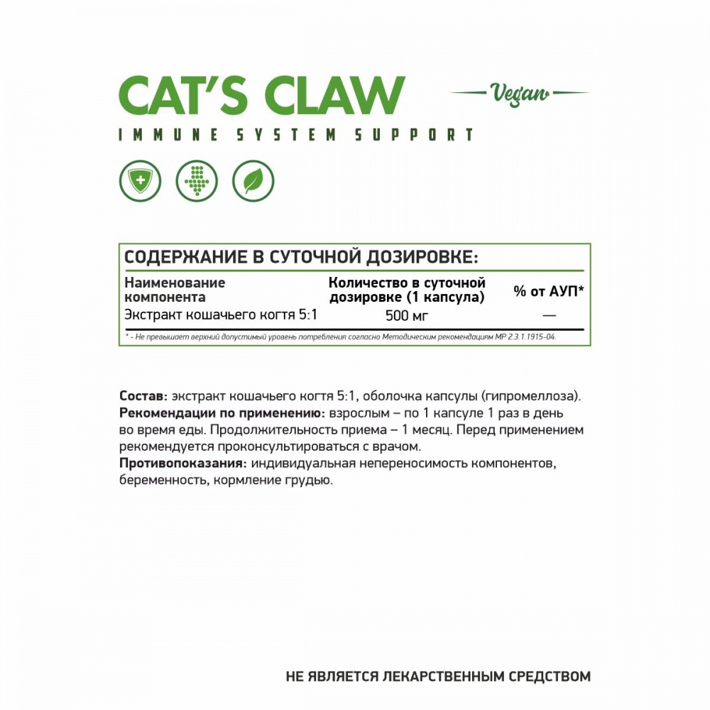 Кошачий коготь является растительным иммунномодулятором, оказывает общетонизирующее действие, активизирует защитные функции в организме, эффективен для профилактики ОРВИ и гриппа.