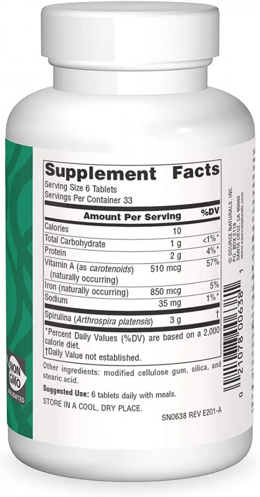 Уже более 30 лет спирулина (Arthrospira platensis) является наилучшей добавкой в вегетарианской диеты. Спирулина от Source Naturals обладает высочайшим качеством. Специальные сине-зеленые водоросли — это богатый источник многочисленных витаминов, минералов, каротеноидов и незаменимых жирных кислот, количество которых трудно поддерживать на достаточном уровне при вегетарианской диете. Наиболее примечательным является высококачественный протеин, который содержит все девять незаменимых аминокислот. Клеточные стенки спирулины не содержат целлюлозы, которая замедляет пищеварение. Спирулина Source Naturals выращивается и собирается без гербицидов и пестицидов.