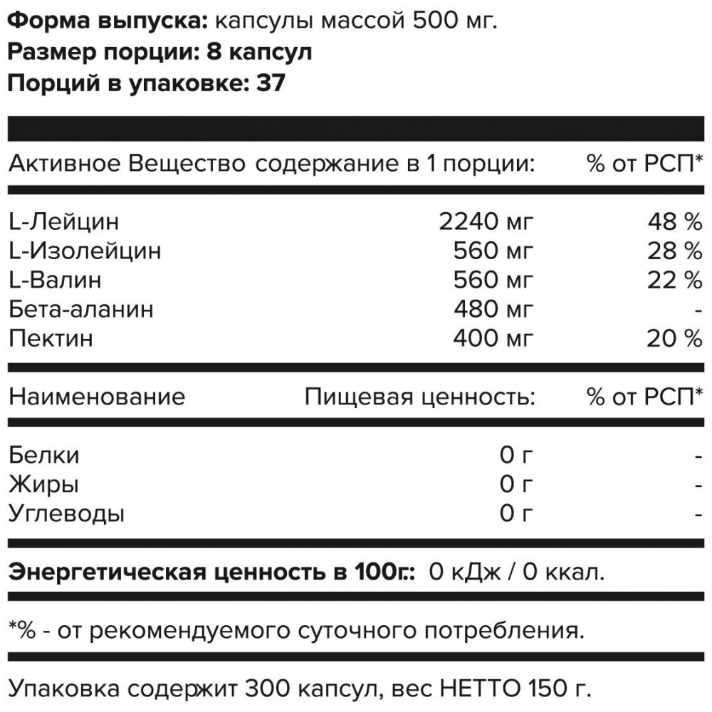 Аминокислотный комплекс ВСАА 4-1-1 – Полностью натуральная добавка незаменимых аминокислот. Входящий в его состав ВСАА в пропорции 4-1-1 эффективно устраняет мышечный катаболизм, активизирует набор мышечной массы, восстанавливает энерго-обмен, ускоряет синтез белка, уменьшает болевые симптомы после интенсивных тренировок. В комплексе с ежедневной физической активностью поможет быстрей похудеть и улучшить состояние кожи, волос, ногтей, а также усилить упругость мышц, делая тело более рельефным – за счет снижения чувства голода и быстрого восполнения аминокислотного состава в организме.