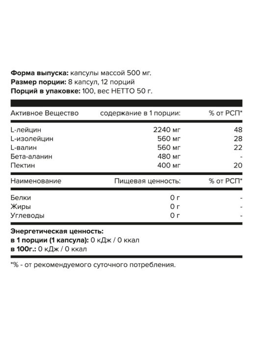 Аминокислотный комплекс ВСАА 4-1-1 - это специализированный пищевой продукт для питания спортсменов. Входящий в его состав ВСАА в пропорции 4-1-1 эффективно устраняет мышечный катаболизм, активизирует набор мышечной массы, восстанавливает энерго-обмен, ускоряет синтез белка, уменьшает болевые симптомы после интенсивных тренировок.