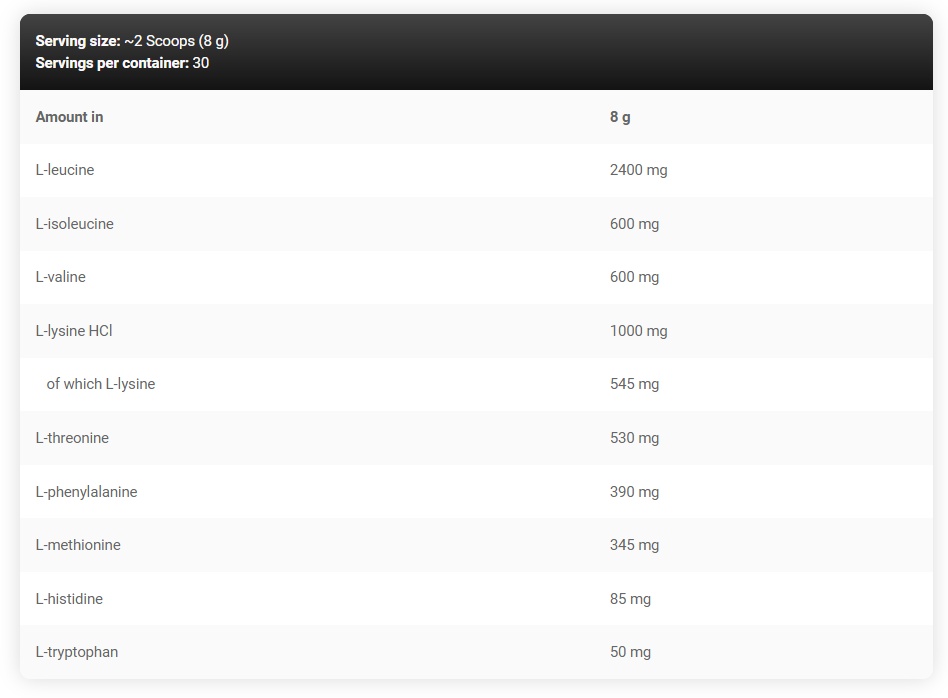 L-валин - 600 мг - поддерживает синтез белка, тормозит распад мышц, направляет правильное развитие многих метаболических реакций. Валин поддерживает восполнение энергии во время тренировки, помогая улучшить энергетический баланс, чтобы организм не использовал мышечные белки.