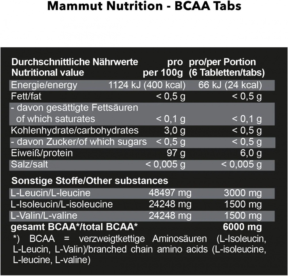 В дополнение к положительному эффекту увеличения и поддержания мышц, белки также способствуют поддержанию нормальных костей. В отличие от многих капсул, BCAA tabs от Mammut не содержат желатина, поэтому они хороши для всех, кто хочет обойтись без ингредиентов животного происхождения. Кроме того, Mammut не использует в таблетках красители, подсластители и консерванты. Кроме того, полностью был исключен коллагеновый белок, а также источники белка из пшеницы, гороха и белка люпина.