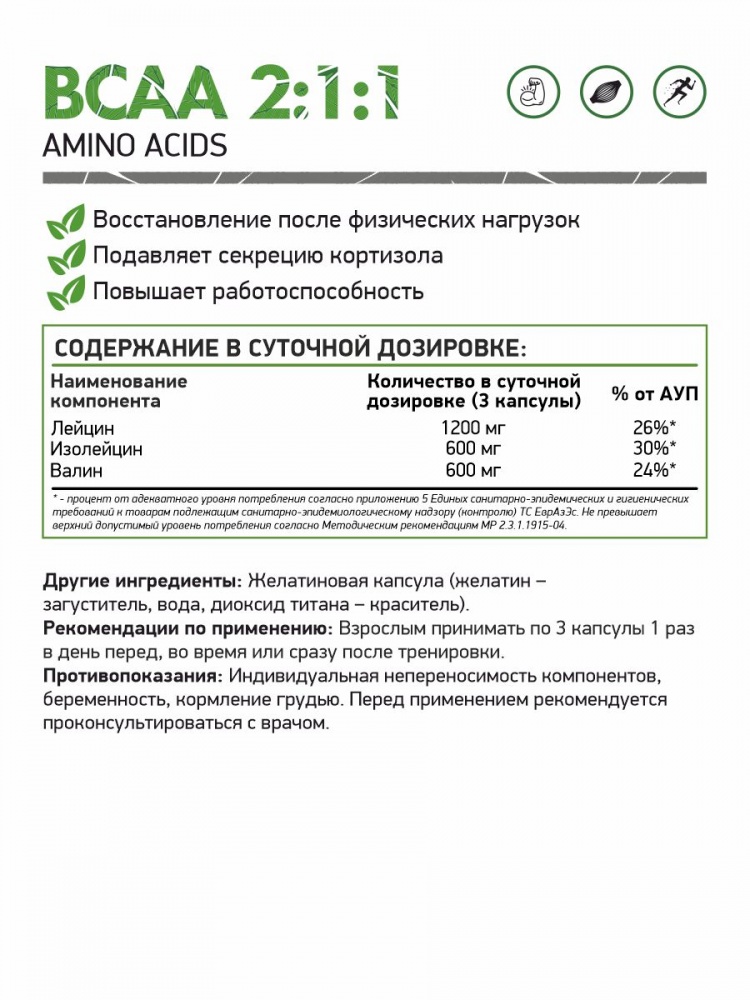 BCAA 2-1-1 - основной материал для построения новых мышц, эти незаменимые аминокислоты составляют 13 от всех аминокислот в мышцах и принимают важное участие в процессах анаболизма и восстановления, обладают антикатаболическим действием. Эти BCAA относятся к разряду 2-1-1 (по соотношению лейцина / изолейцина / валина). BCAA не могут синтезироваться в организме, поэтому человек их может получать только с пищей и специальными добавками. BCAA отличаются от остальных 17 аминокислот тем, что в первую очередь они метаболизируются в мышцах, их можно рассматривать как основное "топливо" для мышц, которое повышает спортивные показатели, предохраняет мышечные волокна от разрушения, способствует увеличению показателей силы и выносливости, ускоряет набор мышечной массы, значительно сокращает массовую долю жировой ткани.