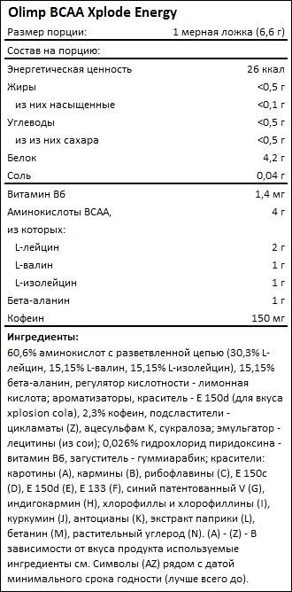 Формула BCAA Xplode Energy от Olimp включает BCAA, бета-аланин и кофеин. В 1 порции содержится 4 г BCAA, 150 мг кофеина и 1 г бета-аланина.