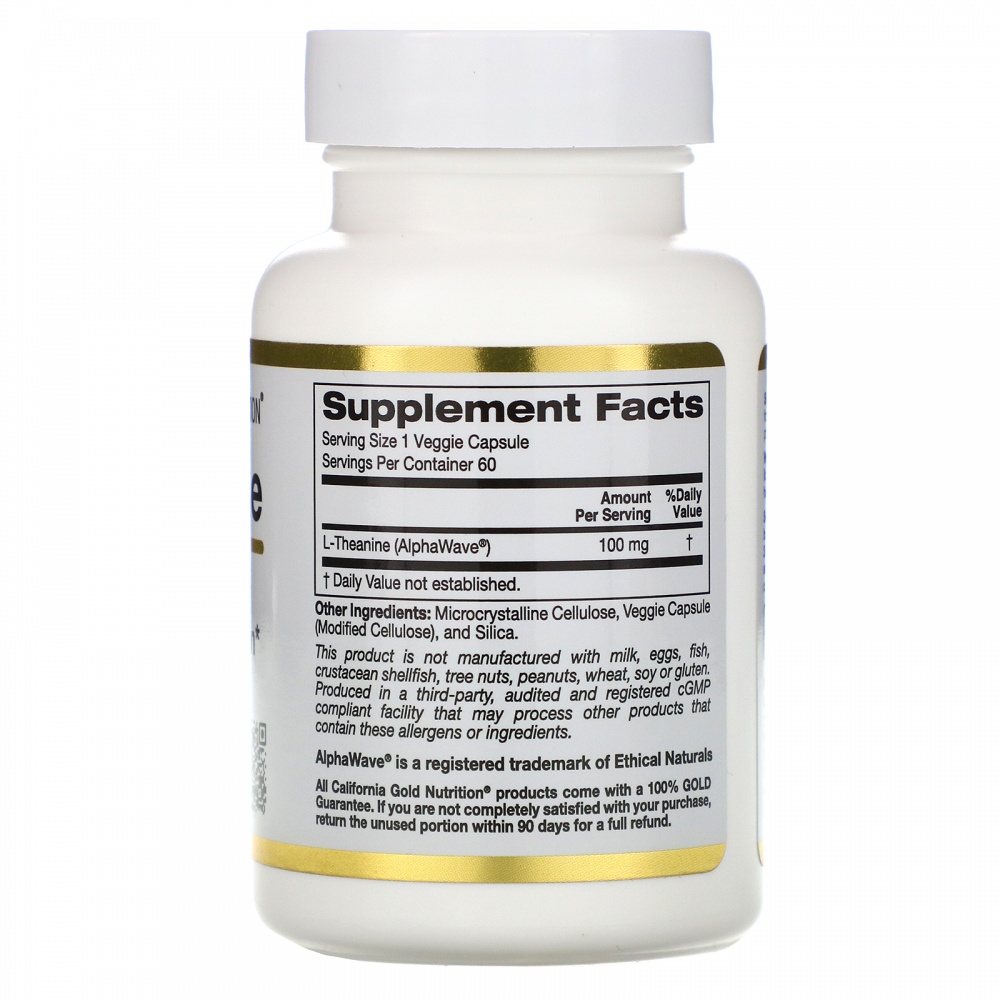 California Gold Nutrition содержит AlphaWave — запатентованную форму L-теанина высокой очистки, стандартизованного до 98%-го содержания L-теанина. Препарат производится в США и соответствует или превосходит все наши количественные и качественные стандарты качества.
