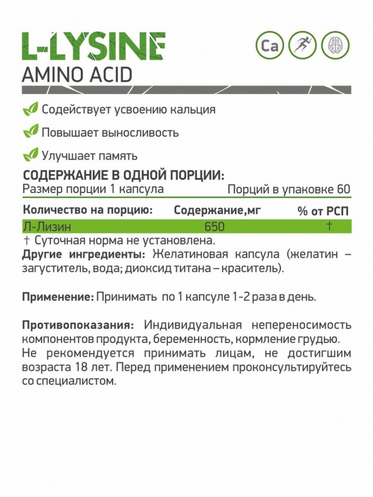 Лизин(L-lysine)-аминокислота, крайне необходимая для жизни человека. Она входит в состав белков и выполняет ряд функций, необходимых для обеспечения нормальной жизнедеятельности человека, что, несомненно, приносит огромную пользу для людей. Она необходима человеку как кислород. Из них состоят волосы, мышцы, кости. Все биохимические процессы, а также иммунная система работает слаженно благодаря этим маленьким веществам. Лизин незаменим при лечении разного рода травм. Благодаря этой аминокислоте в организме накапливается кальций, что предотвращает такую болезнь, как остеопороз. Из-за аминокислот мышцы растут быстрее, увеличивается мышечная масса. Это, конечно же, привлекает спортсменов. Лизин расширяет сосуды, поэтому очень полезен для сердечно-сосудистой системы.