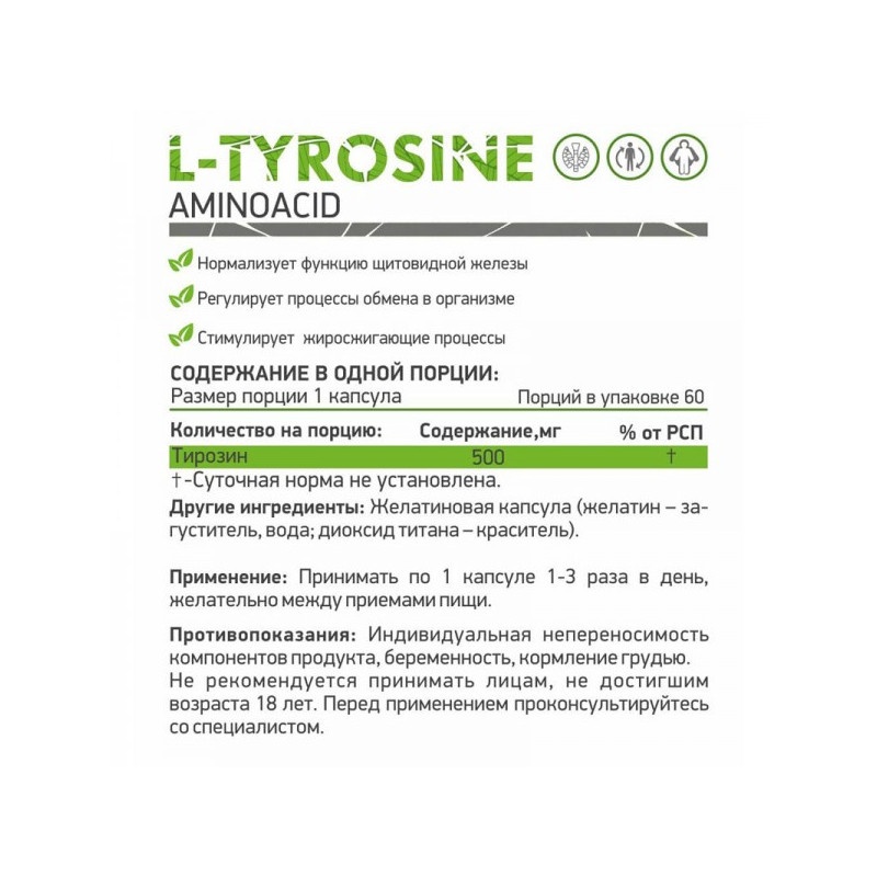 Л-Тирозин стимулирует сжигание жиров, регулирует процессы обмена в организме, нормализует функцию щитовидной железы, увеличивает быстроту прохождения импульсов по нервным волокнам, улучшает концентрацию внимания и память, усиливает насыщение кислородом головного мозга, улучшает активность головного мозга (выражено у детей).