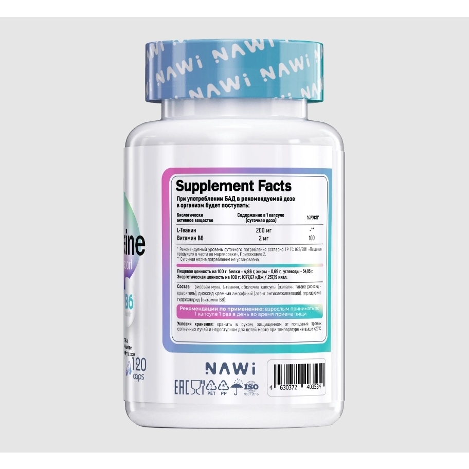 NAWI L-Theanine — это высококачественная добавка, содержащая 200 мг L-теанина и 2 мг витамина B6 в каждой капсуле. L-теанин — аминокислота, известная своими расслабляющими свойствами без седативного эффекта. Она способствует снижению стресса, улучшению концентрации и когнитивных функций, а витамин B6 поддерживает нервную систему и помогает снизить усталость.