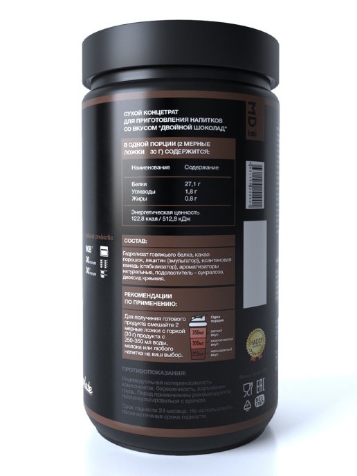 Ингредиенты: Гидролизат говяжьего белка, какао порошок, лецитин (эмульгатор), ксантановая камедь (стабилизитор), ароматизаторы натуральные, подсластитель - сукралоза, диоксид кремния.