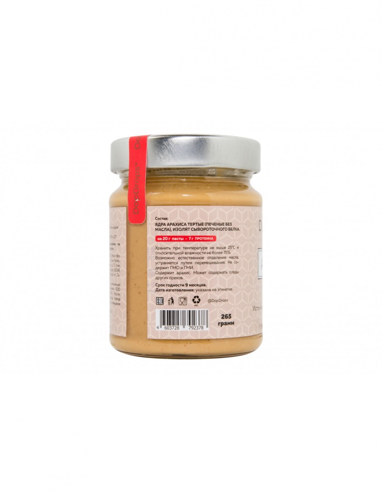 Натуральные ореховые пасты DopDrops, дополнительно обогащенные протеином, содержат до 35% белка! В рецептуру добавлен быстроусвояемый источник белка – изолят сывороточного протеина. Протеиновые пасты DopDrops – продукт, в котором можно быть уверенным на все 100%!