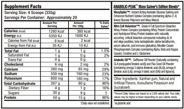 Рекомендации по применению гейнера Anabolic Peak Gainer: Размешайте 4 мерных ложки продукта с 800 мл воды или молока. Из-за высококонцентрированной формулы данного продукта вы можете снизить потребляемую порцию вдвое, потребляя от 2 до 3 раз в день. В зависимости от индивидуальных потребностей в дополнительных калориях возможно употребление дополнительных порций. Не употреблять в качестве единственного источника питания.