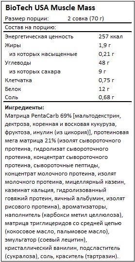 Как и все продукты BioTech USA, Muscle Mass состоит из безопасных и тщательно подобранных компонентов.