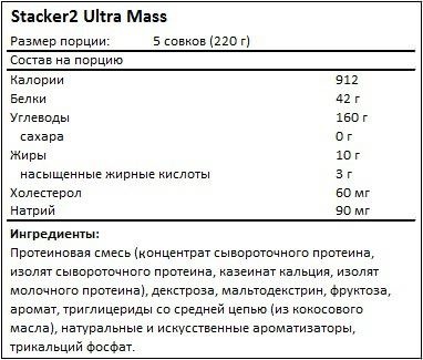 Ultra Mass не содержит составляющих, которых не должно быть в гейнере. В нем нет креатина, кофеина, гормонов и аспартама.