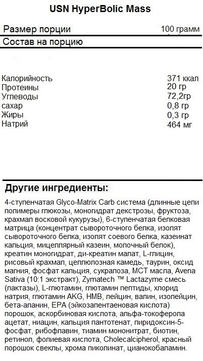 HyperBolic Mass – это реальное топливо, вобравшее в себя все необходимое для вашего развития. В каждой порции вас ожидает не только ударная доза высококачественных белков и углеводов, но и еще витамины, минералы, растительные экстракты, активаторы mTOR, а также масса других важных компонентов. Все это вы получаете в форме порошка, который быстро и легко превращается во вкусный, а главное, легкоусвояемый коктейль.