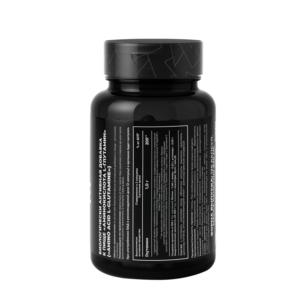 Состав: L-глутамин, рисовая мука, оболочка капсулы (желатин, краситель – диоксид титана), антислеживающий агент – диоксид кремния аморфный.