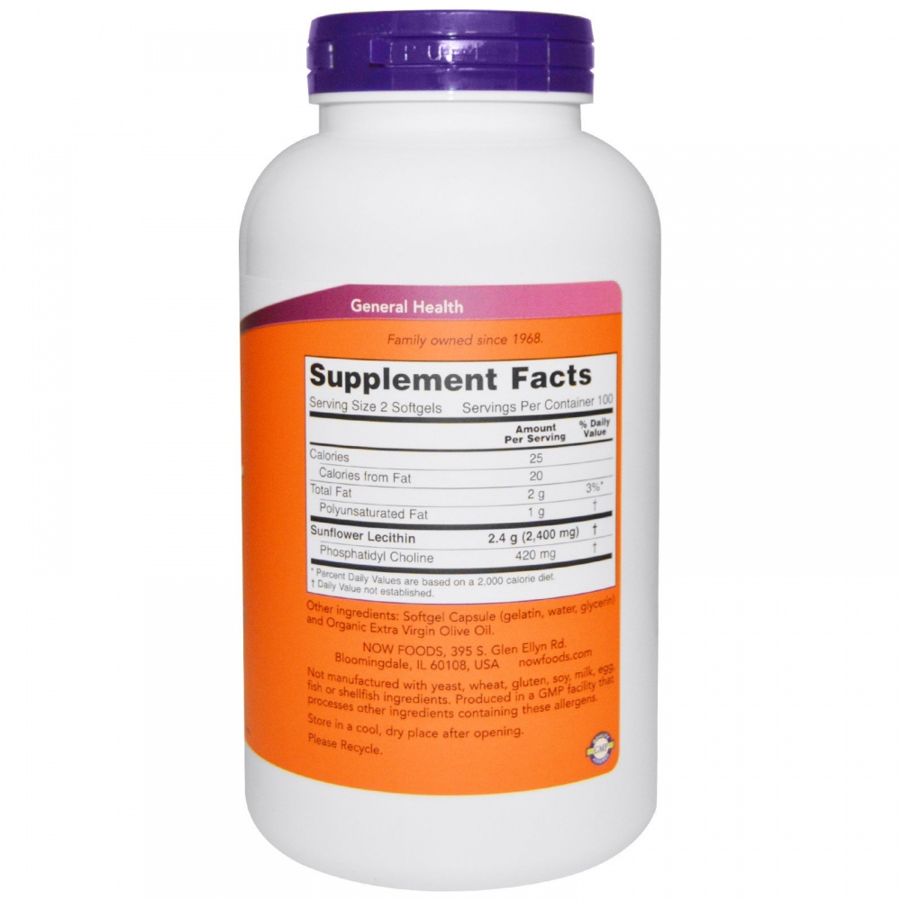 Лецитин из подсолнечника от NOW содержит фосфатидилхолин, самый распространенный фосфолипид в клеточной мембране, где он играет ключевую роль в клеточной связи и синаптической передаче. Кроме того, лецитин из подсолнечника от NOW природным образом содержит фосфатидилинозитол, фосфатидил этаноламин и незаменимые жирные кислоты. Введение лецитина в рацион поддерживает эмульгирование жиров, способствуя их растворению в воде; а так как он является фосфолипидом, содержащим холин, то организм легко усваивает его. Мягкие таблетки с лецитином из подсолнечника от NOW не содержат ГМО и сои.