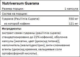 В составе Guarana от Nutriversum находится экстракт гуараны. На 1 порцию приходится 550 мг данного растительного экстракта. В нем содержится кофеин, причем он отличается от кофеина из кофейных зерен. В чем его особенность? Кофеин из гуараны, или гуаранин, медленнее всасывается организмом. Что это дает? Эффект от его использования длится дольше, а также уменьшается вероятность побочных эффектов, т.е. гуаранин мягче воздействует на организм, поэтому его могут применять те, кто плохо переносит обычную форму кофеина.