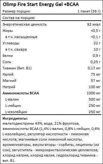 Формула энергетического геля Fire Start Energy Gel plus BCAA включает углеводы мальтодекстрин и фруктозу, а также BCAA, или аминокислоты с разветвленными боковыми цепочками. В составе комплекса присутствуют также магний, натрий и калий.