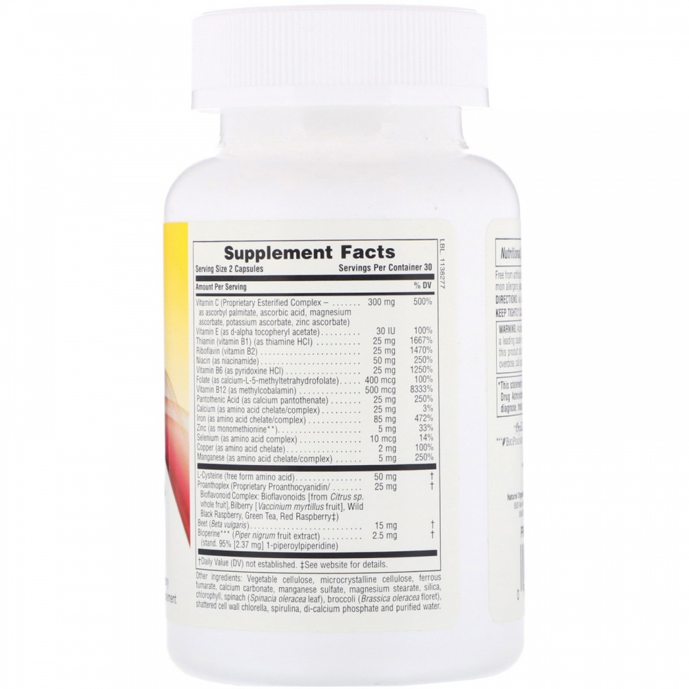 | Proanthoplex (Запатентованный проантоцианидин / биофлавоноидный комплекс: | биофлавоноиды (из экстрактов лимонника цитрусовых), черника (плоды вацциниума myrtillus), ежевика (плоды плодоножки Rubus), зеленый чай (лист камелии синенса), черная и красная малина (плоды Rubus idaeus)): 25 мг |