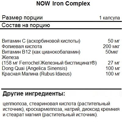 Комплекс железа Now — это уникальная смесь железа Ferrochel (биодоступная форма железа) и его важных вспомогательных веществ в сочетании с дополнительными растительными ингредиентами. Железо является минералом, необходимым для образования гемоглобина, молекулы, которая транспортирует кислород клеткам по всему организму в эритроцитах. Витамин B12 и фолат необходимы для производства красных кровяных клеток, в то время как витамин C улучшает усвоение железа из желудочно-кишечного тракта. Эта вегетарианская формула хорошо переносима, не вызывает запоров и была разработана для максимального усвоения железа организмом.