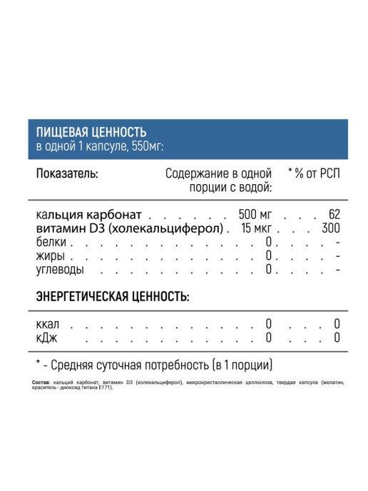 Состав: кальций карбонат, витамин D3 (холекальциферол), микрокристаллическая целлюлоза, твердая капсула (желатин, краситель - диоксид титана Е171).