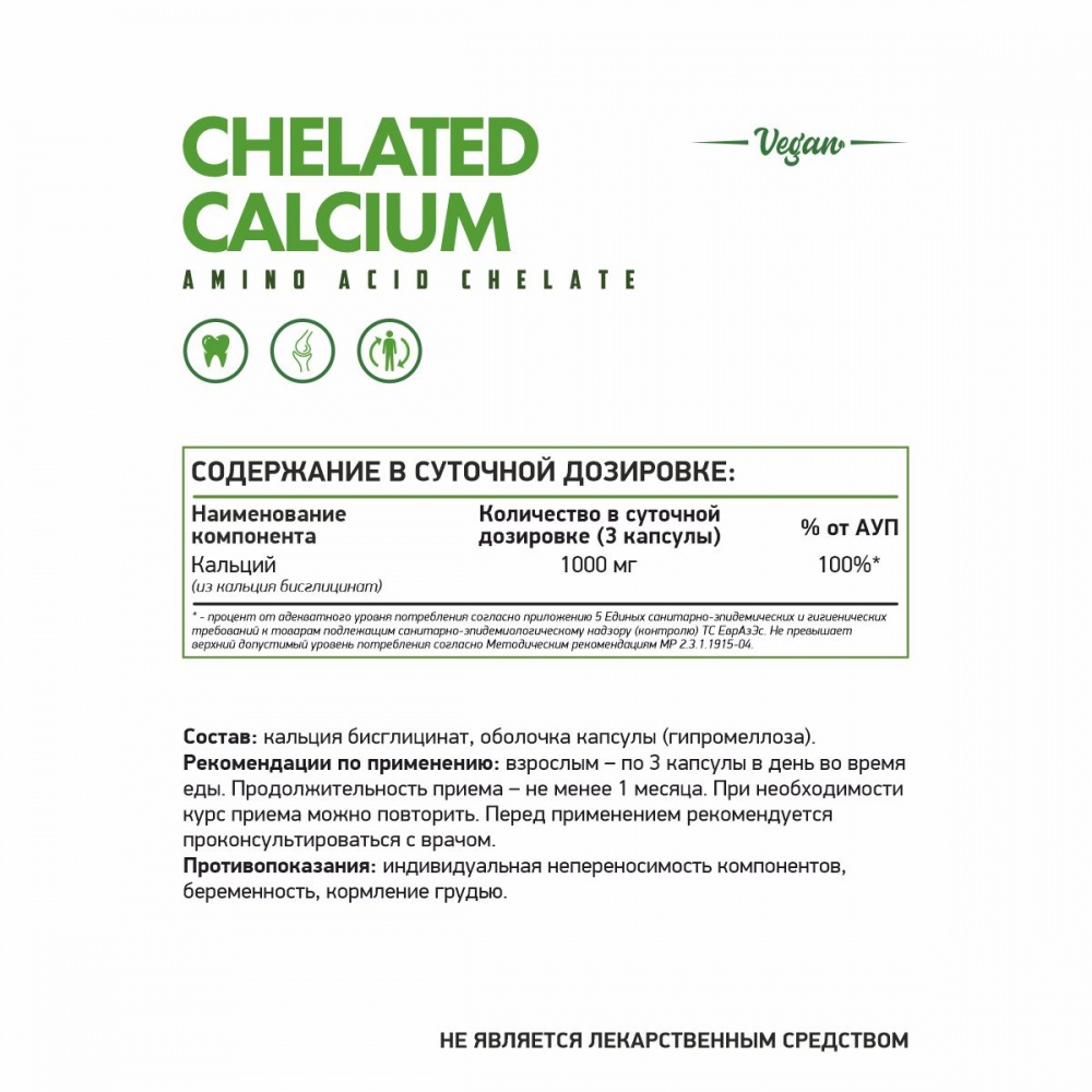 Chelated Calcium - легко усваиваемая форма кальция, основного макроэлемента в организме человека.