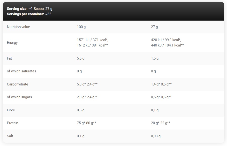 Применение: Для получения одной порции смешать 1 мерную ложку протеина (27 г) с 200-250 мл воды. Пить 3-4 порции в день – после завтрака, за 60-90 минут до тренировки, сразу после тренировки и за 30-60 минут до сна.