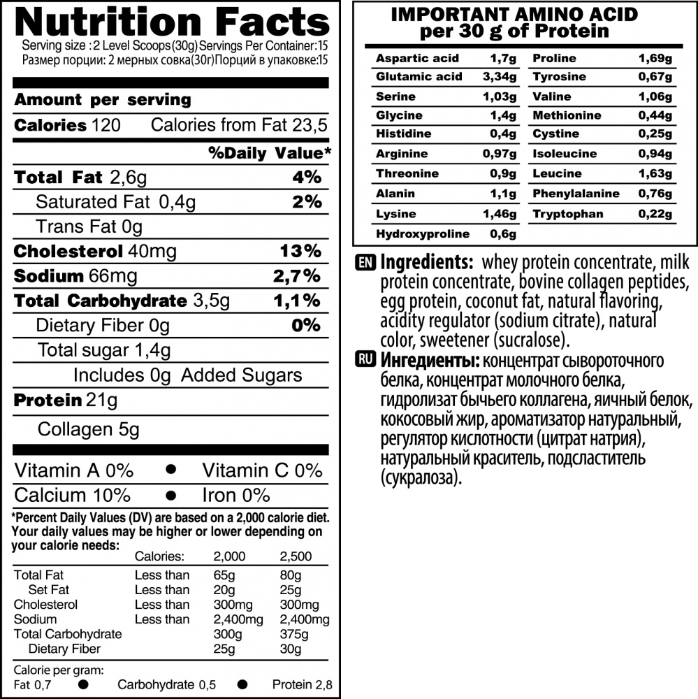 В состав Life Protein Collagen входит сочетание концентрата сывороточного белка, концентрата молочного белка и яичного белка, таким образом предоставляя широкий аминокислотный профиль в каждой порции!