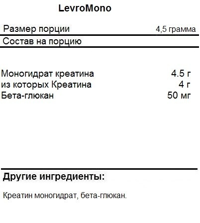 Уникальность креатина LevroMono от Кевина Марка Леврона заключена в том, что помимо креатина моногидрата в этом средстве содержится инновационный компонент Beta glucan (Бета-Глюкан). Это полисахарид, он имеет натуральное происхождение и является иммуномодулятором, повышает защитные силы организма.
