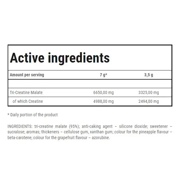 Состав: Эффективное сочетание трикреатин малата, который включает три молекулы креатина и малат (яблочную кислоту), поддерживает оптимальный уровень креатина в мышцах и ускоряет энергетические процессы.