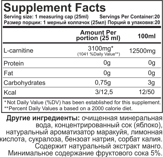 Размер одной порции 25 миллилитров с содержанием 3100 мг Л-карнитина.