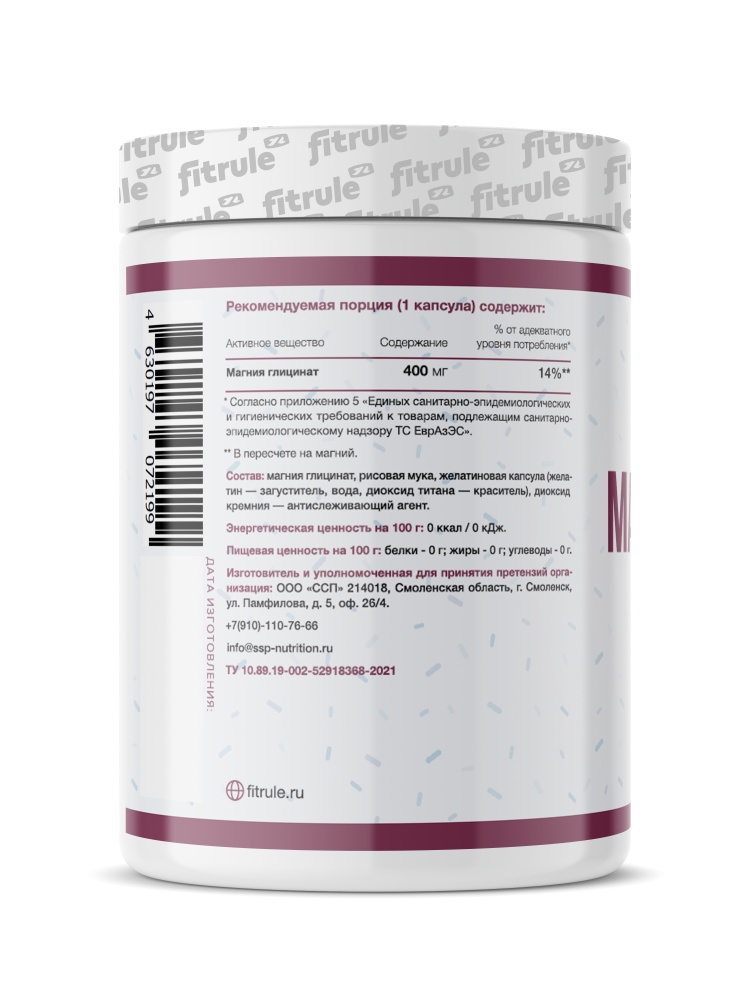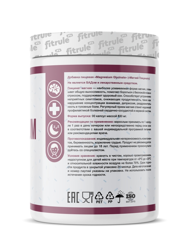 Fitrule Magnesium Glycinate – это хелатная форма магния, усиленная аминокислотой глицином. Хелатный магний имеет самую высокую биодоступность для организма, с лёгкостью проходит гемато-энцефалический барьер и максимально эффективно усваивается организмом.