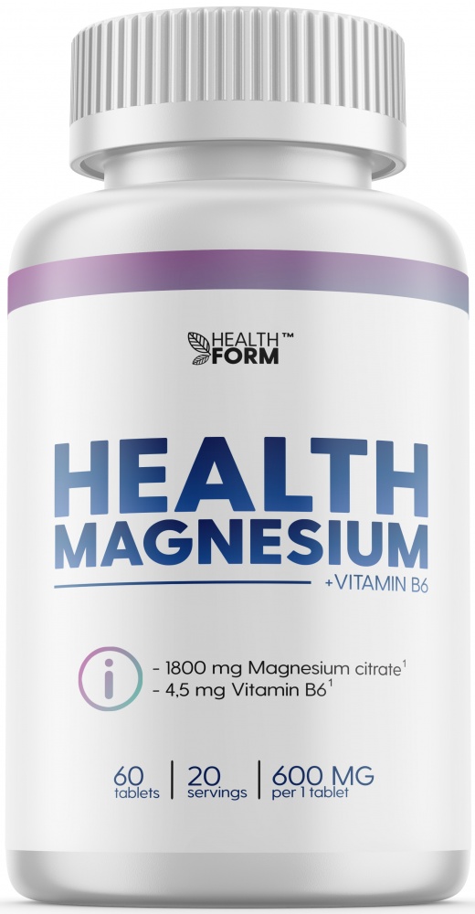 HEALTH MAGNESIUM + Vitamin B6 от HEALTH FORM - это источник минерала магния в форме цитрата с витамином B6 (пиридоксином гидрохлоридом) в таблетках.