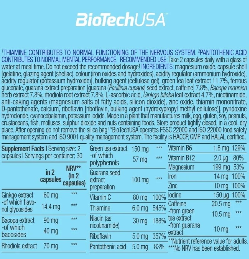 Магний, витамин С, тиамин, ниацин, рибофлавин, витамины В6 и В12, а также йод в капсулах Neuro способствуют правильному функционированию нервной системы и способствуют достижению высоких результатов умственной деятельности.