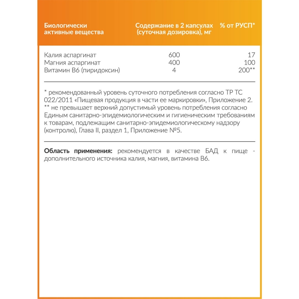 Состав: Калия аспаргинат, магния аспаргинат, витамин В6 (пиридоксин), микрокристаллическая целлюлоза, капсула (желатин).