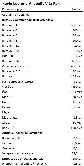 С каждой порцией Anabolic Vita Pak от Kevine Levrone вы снабдите себя порцией витаминов и минералов. Витаминная составляющая комплекса сформирована витаминами группы Б, витаминами А, С и Е, а также витамином Д. Каждый из витаминов необходим нашему организму для поддержания множества процессов. Основные функции витаминов группы Б – энергетическая поддержка организма, участие в обменных процессах и в кроветворении, улучшение работы нервной системы и помощь в борьбе с ментальной усталостью, стимулирование сердечной деятельности.