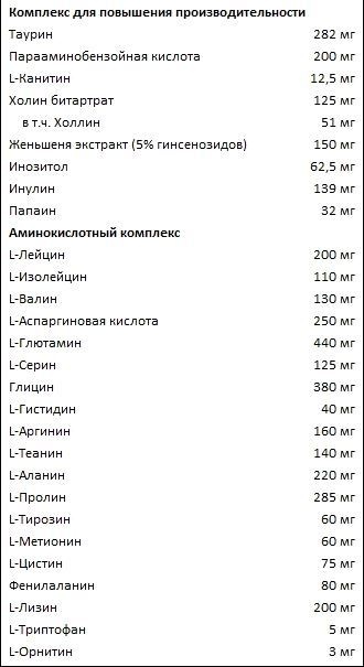 Формула комплекса дополнена аминокислотами. Среди них имеются BCAA, а именно лейцин, изолейцин и валин, глютамин, таурин. В чем ценность аминокислот? Они используются нашим организмом для роста и восстановления всех тканей, в том числе мышц.