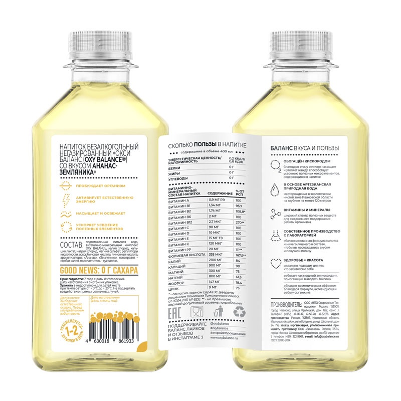 Продукт содержит в одной бутылочке 100% дневную норму почти по всем витаминам и минералам, которые отлично усваиваются организмом, благодаря насыщению воды кислородом; при этом в составе нет сахара и никаких вредных ароматизаторов и красителей.