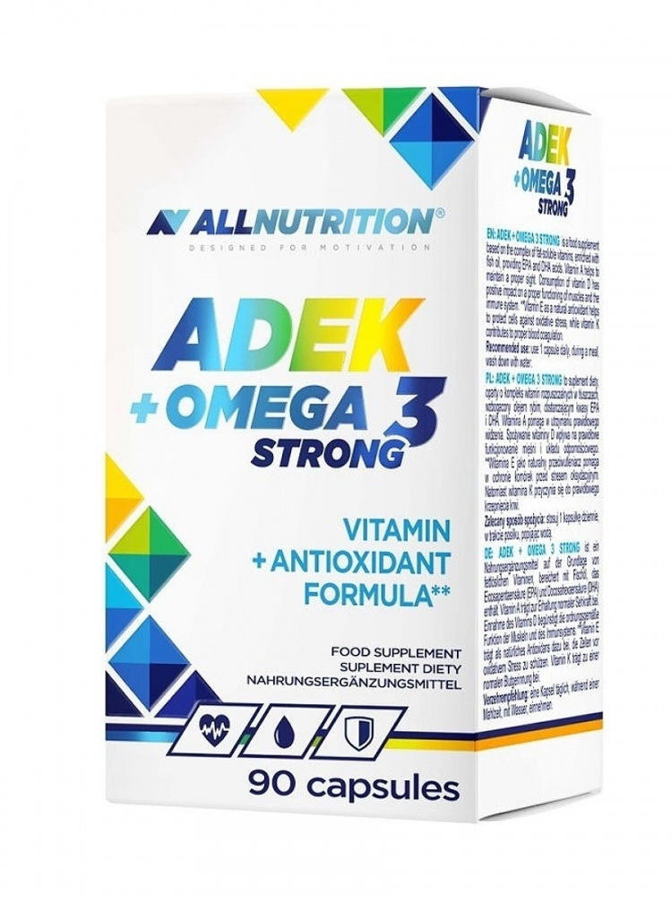 ALLNUTRITION ADEK + Omega 3 Strong - добавка на основе комплекса жирорастворимых витаминов, обогащенная рыбьим жиром, ЭПК и ДГК. Они отвечают за состояние кожи, предотвращают воспаление, являются антикоагулянтами и влияют на остроту зрения. Применение Омега-3 может способствовать снижению риска сердечных заболеваний и улучшению физического и психического состояния. Кроме того, он обеспечивает поддержание здоровых костей. Добавка ОМЕГА 3 защищает организм от артрита, снимает боль и скованность, сопровождающие ревматические заболевания. Они также облегчают усвоение кальция. Омега-3 кислоты обладают способностью связывать и растворять насыщенные кислоты, благодаря чему улучшают очищение организма от отложений.