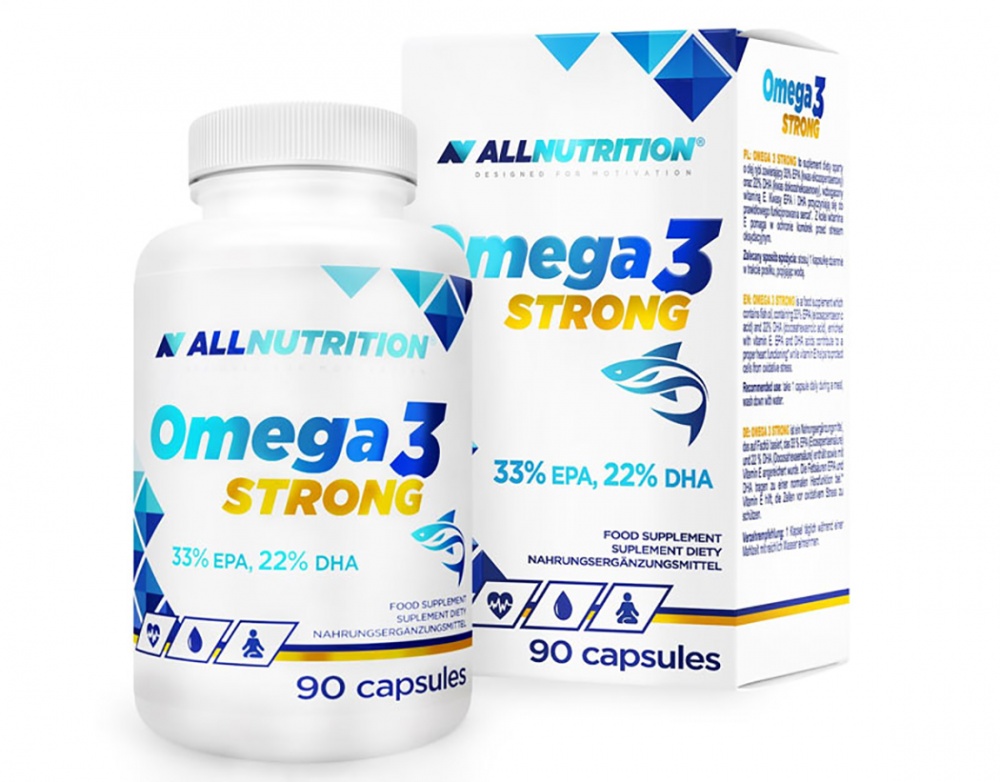 Omega 3 Strong - это пищевая добавка на основе рыбьего жира, содержащая 33% EPA (эйкозапентаеновая кислота) и 22% DHA (докозагексаеновая кислота), обогащенная витамином E.