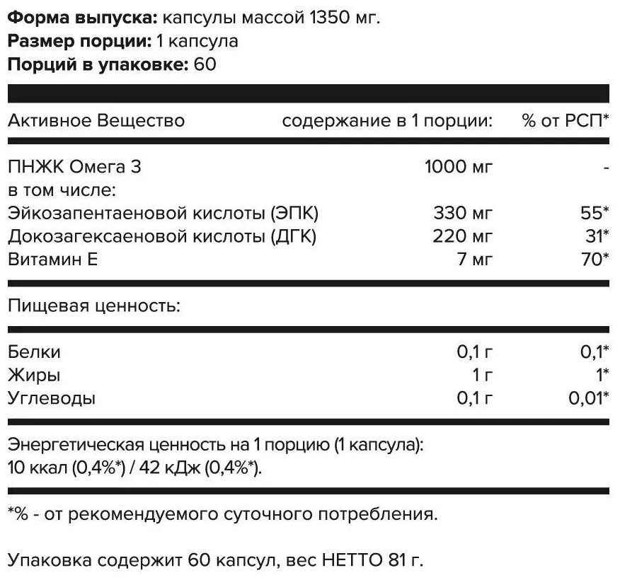 Омега 3 кислоты - важнейшая составляющая часть диеты современного человека, поскольку они позволяют сохранить нормальные функции мозга, суставов, иммунитета и другие жизненно важные функции. Входящий в состав продукта витамин Е дополнительно защитит ваш организм от рака, болезней сердца, атеросклероза, варикозного расширения вен и других заболеваний.