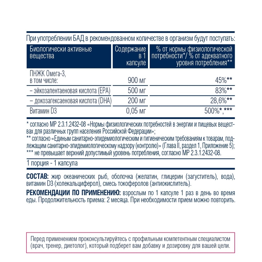 Omega-3 + Vitamin D3 – добавка, сочетающая в себе незаменимые жирные кислоты омега-3, необходимые для здоровья клеток, и витамин D, отвечающий за укрепление костей и секрецию гормонов. Эйкозапентаеновая кислота (ЭПК) и докозагексаеновая кислота (ДГК) из группы омега-3 поддерживают нормальную работу нервной и сердечно-сосудистой систем, снижают вредный холестерин, подавляют воспаления, улучшают интеллектуальные функции. Витамин D укрепляет иммунитет, обеспечивает усвоение кальция костной тканью, поддерживает гормональный фон. Сочетание этих важнейших компонентов помогает сохранять здоровье и жизненную активность, особенно при повышенных спортивных и рабочих нагрузках, а также в периоды сезонных респираторных инфекций.