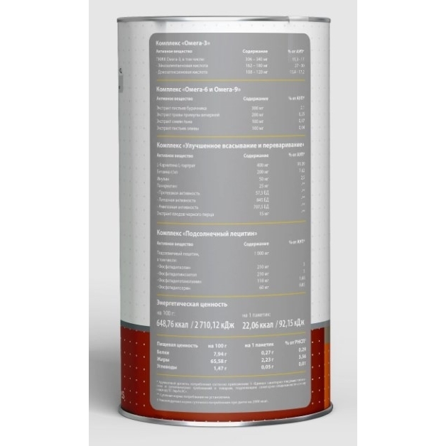 Комплекс «Омега-3» (софтгель): жир рыб океанических пород (лососевые); мягкая желатиновоя капсула (желатин пищевой - носитель, глицерин - агент влогоудерживаюций, лимонная кислота - антиокислитель); смесь токоферолов - антиокислитель.